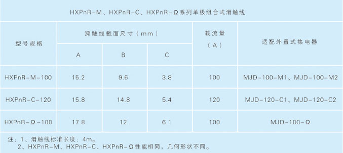 HXPnR-M、HXPnR-C、HXPnR-Ω系列組合式滑觸線由M型、C型、Ω型銅導(dǎo)管與相配置的PVC絕護(hù)套、外置式集電器以及與之相對應(yīng)的支架、端口、嗽叭口、接頭滑座等組件組合而成。該產(chǎn)品以其體積小、結(jié)構(gòu)緊湊、性能穩(wěn)定、組合自由等特點(diǎn)被廣泛地應(yīng)用于汽車、郵電、機(jī)械、化工、煙草、電器等行業(yè)的輸送線、檢測線作為移動供電和信號傳輸。